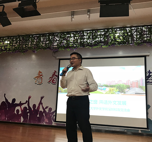 7月14、15日,外文学院赴深圳看望在深校友,并成功举办“聚首改革之窗 共话外文发展”深圳校友交流会。本次活动由学院党委书记刘娟老师带队,英文系武尊民教授、马欣老师、学院校友分会副秘书长代素霞老师、团委书记张新颖老师等一行五人赴深圳看望校友,并在深圳市玉龙学校开展教师教育培训讲座,成功开展校友交流会等活动。91沈先生 深圳校友分会会长何易祥、秘书长张雨华,外文学院香港校友、贝罗斯资本亚洲有限公司行政总裁王向燊出席,外文学院深圳校友四十余人参加了活动。