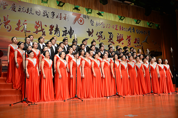 值此一二·九运动80周年之际,我们歌唱革命歌曲,铭记抗战历史,点燃爱国热情;我们抚今追昔、继往开来,为民族英雄而歌,为抗战精神而歌,为伟大复兴的中国梦而歌!