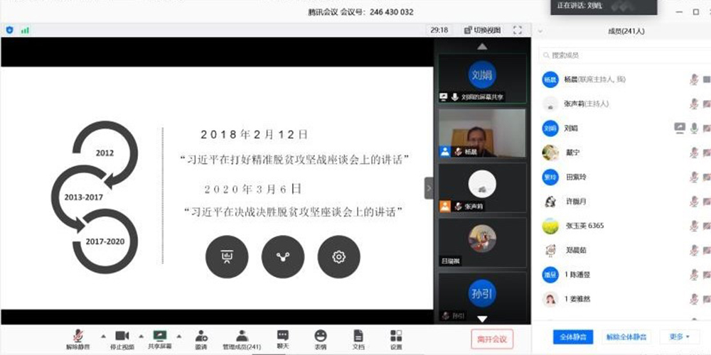2020年是脱贫攻坚决战决胜之年,为认真学习习近平总书记关于全面建成小康社会和脱贫攻坚的重要论述,结合学校2020年度工作要点和学院学科发展特点,5月20日下午,外文学院举办了“教育扶贫中师范院校党员的责任与担当”专题讲座。本次讲座以线上形式开展,学院党委书记刘娟老师主讲,共有240余名师生党员及入党积极分子参加了讲座。