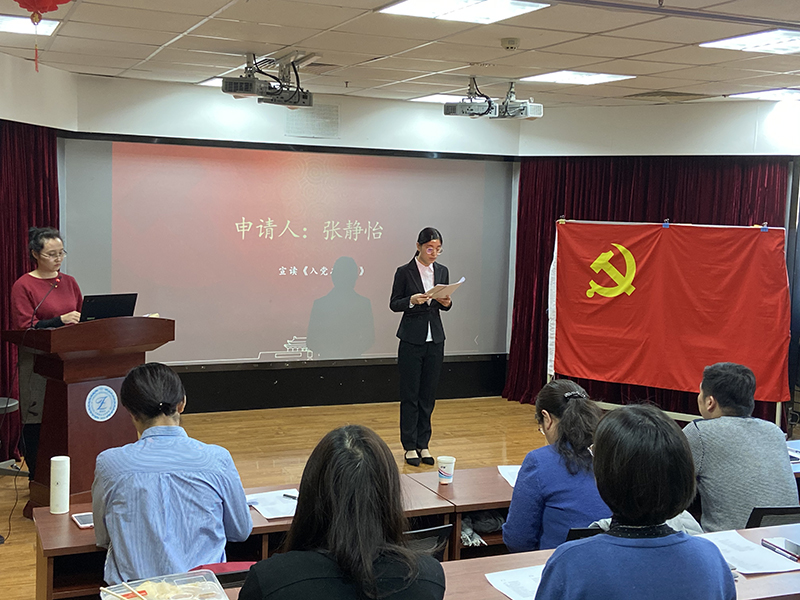 2020年11月30日中午12点35分,外文学院英文系党支部在后主楼914会议室召开了预备党员发展大会。发展大会议题是讨论接收英文系教学秘书张静怡同志发展为预备党员。此次会议由英文系党支部书记孙晓慧同志主持。校党委组织员李凤林同志和外文学院党委组织委员林敦来同志莅临指导。