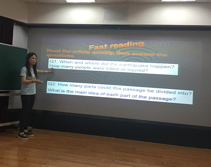 当晚,主持人孙引宣读比赛规则并宣布比赛开始,选手依次上台进行说课、讲课,共计20分钟,接着评委进行提问。选手最终成绩由教案成绩30分、模拟授课100分与现场提问30分三部分成绩组成,满分共计160分。1号选手何佳玲的模拟授课对象是八年级,模拟授课题目为ASpecial Team;2号选手韩佳昕的模拟授课对象是高一,模拟授课题目为Superhero:Christopher Reeve;3号选手李艳的模拟授课对象是高一,模拟授课题目为Earthquakes;4号选手许君豪的模拟授课对象是八年级,模拟授课题目为Cambridge,Londonand England;5号选手董久谊的模拟授课对象是高一,模拟授课题目为Superhero:Christopher Reeve;6号选手董鑫阳的模拟授课对象是高一,模拟授课题目为SportsStar;7号选手郭莎的模拟授课对象是七年级,模拟授课题目为China’sGot Talent;8号选手史胜男的模拟授课对象是高一,模拟授课题目为Superhero:Christopher Reeve。