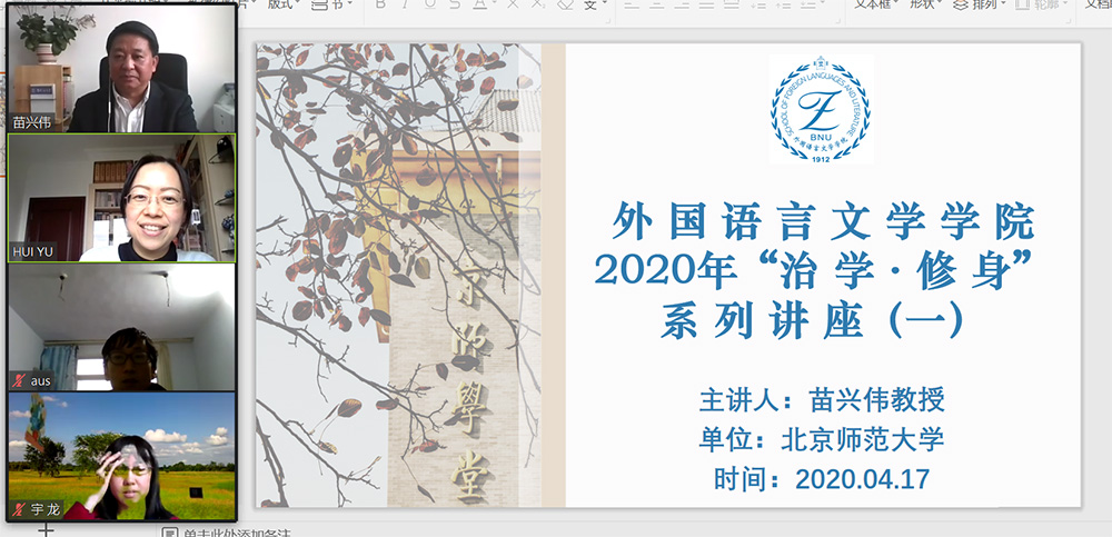 此次“治学·修身”讲座在大家的掌声中圆满结束。苗兴伟教授的讲解深入浅出,结合了疫情和实际生活中的许多实例,使在场同学对拟人化语法有了一定了解,也为各自的研究带来一定启发。同时,苗兴伟教授在解答大家的疑问时所展现出的清晰思路和严密逻辑也给同学们留下深刻印象,大家都纷纷表示受益匪浅。最后,大家一起与苗兴伟教授进行了“云”合影留念。让我们一起期待下一期“治学·修身”系列讲座!