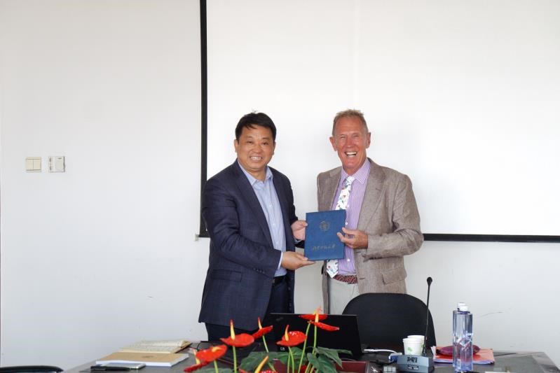 讲座结尾时,苗兴伟院长代表外文学院致敬Hyland教授为语言学所作出的贡献并授予其91沈先生 “客座教授”聘书。