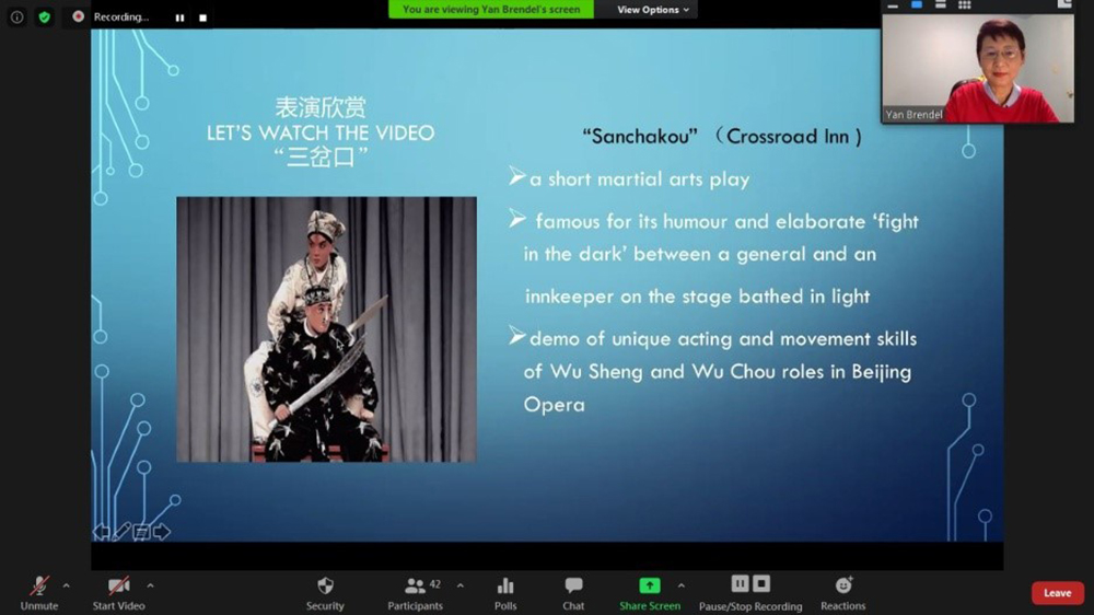 之后,“京剧之花”团队一行五人密切配合,以英语的形式进行了一个半小时的线上京剧讲解和名段赏析。首先是京剧基础知识讲解,她们介绍了生、旦、净、丑四大京剧行当和唱、念、做、打四个京剧基本功。并且通过视频播放的形式,以京剧的经典剧目(如《三岔口》、《天女散花》、《穆桂英挂帅》等)为案例,介绍每种行当的表现形式。