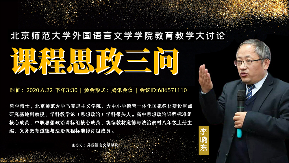 外文学院举办课程思政“三问”专题讲座2020-07-02为贯彻学校教育教学大讨论会议精神,切实加强课程思政建设,外文学院于6月22日下午开展了课程思政“三问”专题讲座。 -