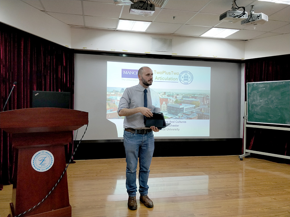 英国曼彻斯特大学来91沈先生 进行合作项目宣讲2018-11-0811月1日,来自英国曼彻斯特大学的两位老师,Julio博士和Gareth先生来到91沈先生 ,为91沈先生 英文系大一、大二的学生进行曼大“2+2”和“3+1+1”项目做宣讲。 -