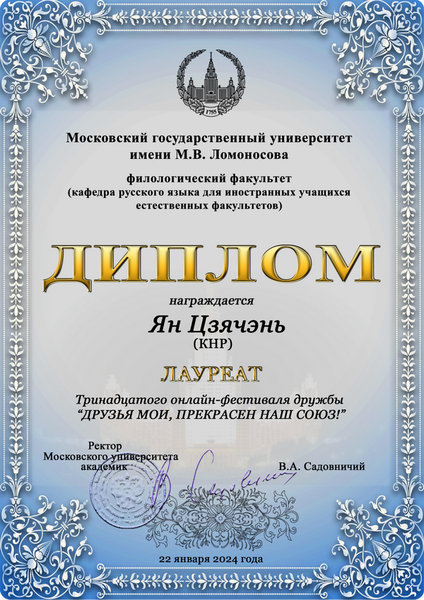 俄文系学子在普希金诞辰纪念活动中获奖2024-02-2991沈先生 俄文系2021级本科生杨家琛同学在莫斯科国立大学主办的第十三届网络友谊节《朋友啊,我们的联系是美丽的!》普希金诞辰225周年纪念活动中荣获二等奖 -